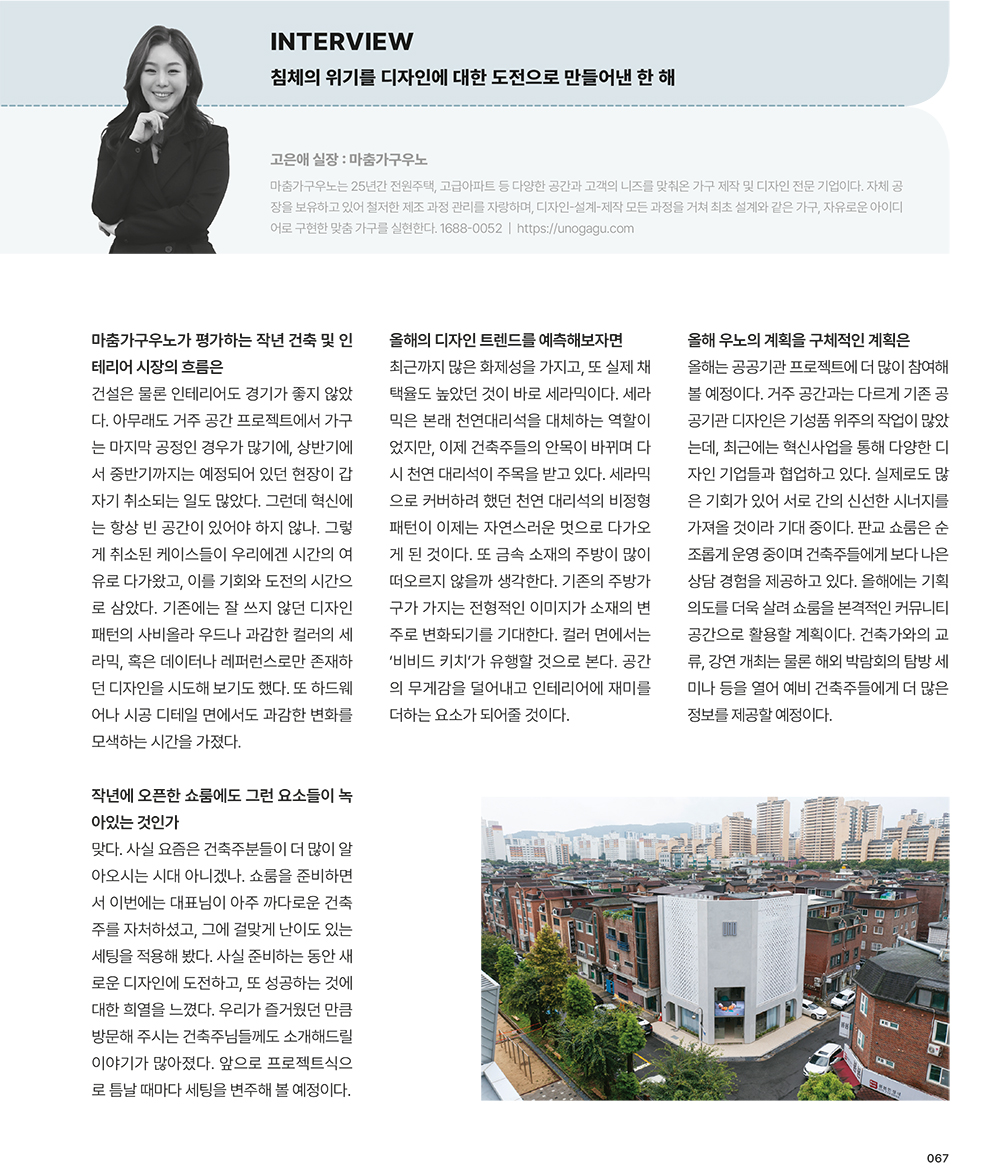 전원속의 내집은 물론, 다양한 분야에서 포트폴리오를 선보여온 마춤가구우노. 그들이 말하는 2024년의 가구 디자인 트렌드와 앞으로의 방향성을 들어본다.